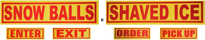 SIGNS made of weatherproof Coroplast® plastic are ideal for promotion and increase efficiency of your business. The "SNOW BALLS” and “SHAVED ICE” sign measures 8" x 32". The other signs measure 12" x 4". The signs can be mounted to any flat surface with silicone rubber sealant. All signs are red letters on yellow background.